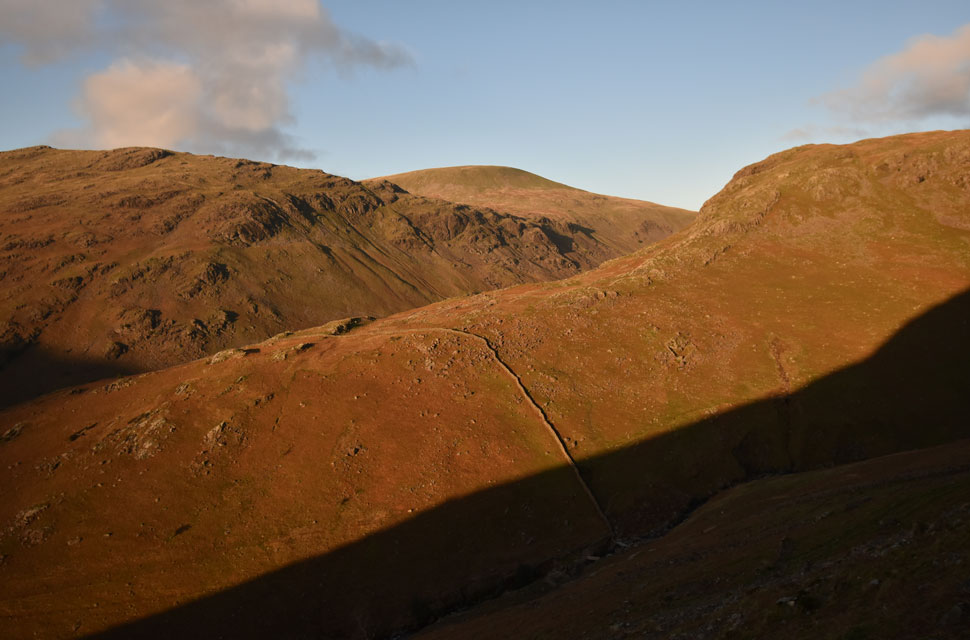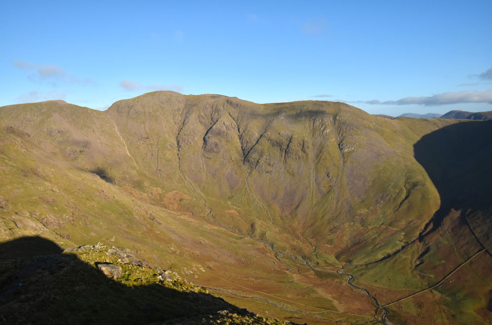 | Looking down on Low Red Pike with the Mosedale Valley flanked by Kirk Fell beyond. |