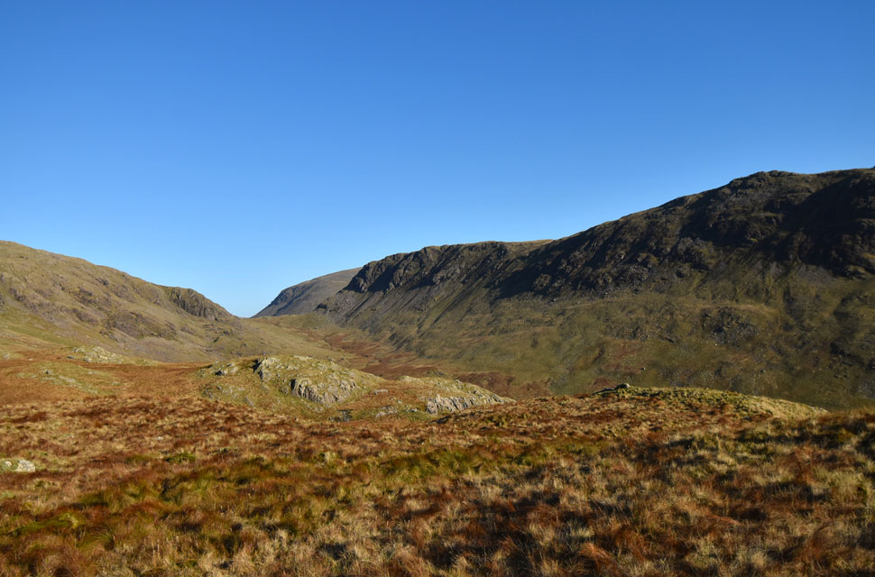 | View through the Over Beck valley towards Dore Head, Kirk Fell and Yewbarrow. |
