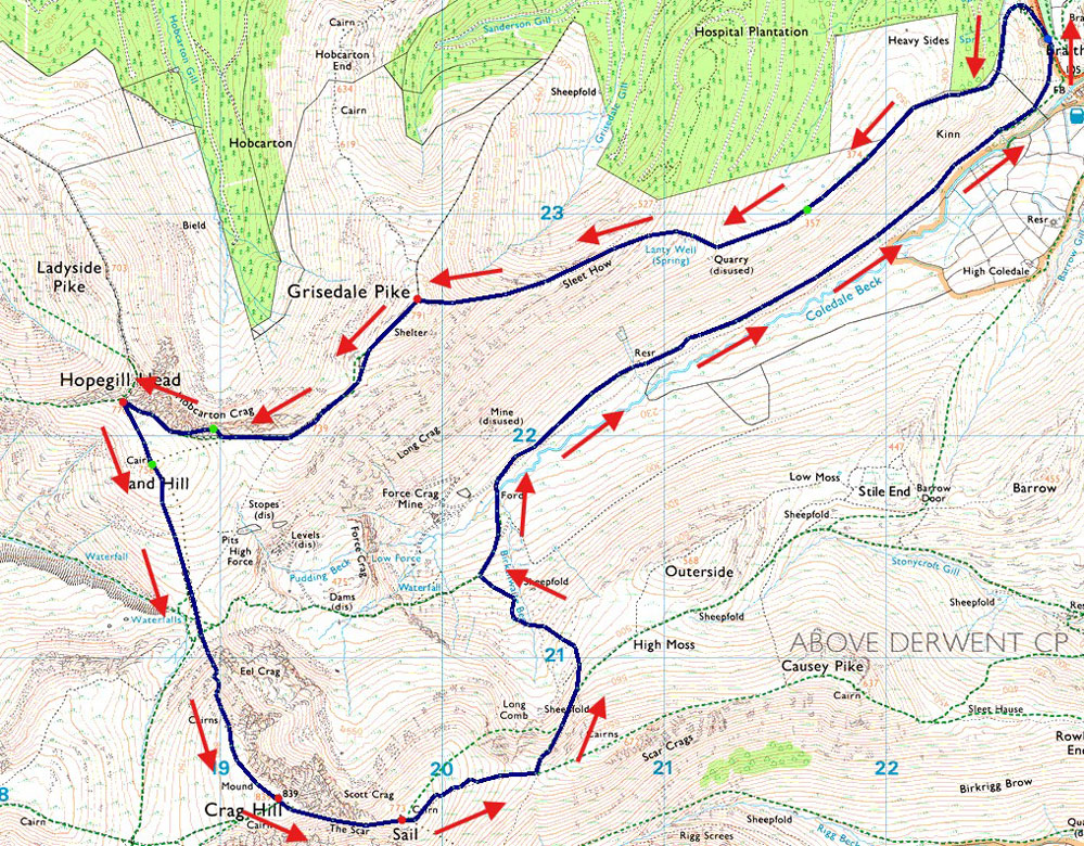 Car Park, Whinlatter Pass - Kinn - Sleet How - Grisedale Pike - Hobcarton Head - Sand Hill - Coledale Hause - Eel Crag - Eel Crag (Crag Hill) - The Scar - Sail - Sail Pass - Coledale Beck - Coledale - Car Park, Whinlatter Pass |