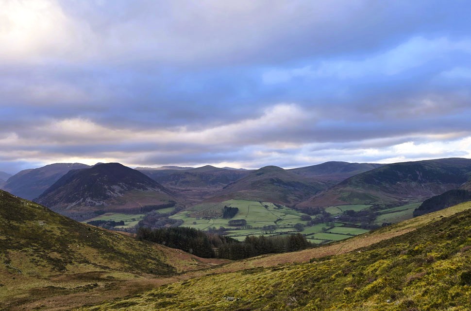 | Views towards a distant Fellbarrow, Smithy Fell and Sourfoot Fell. |