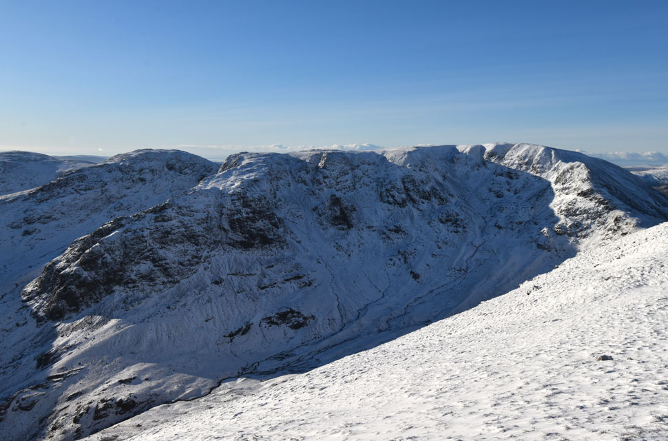 | The vast crags on the east flanks of Dollywagon Pike are Tarn Crag and Falcon Crag with The Tongue ridge in sunshine towards the right. |