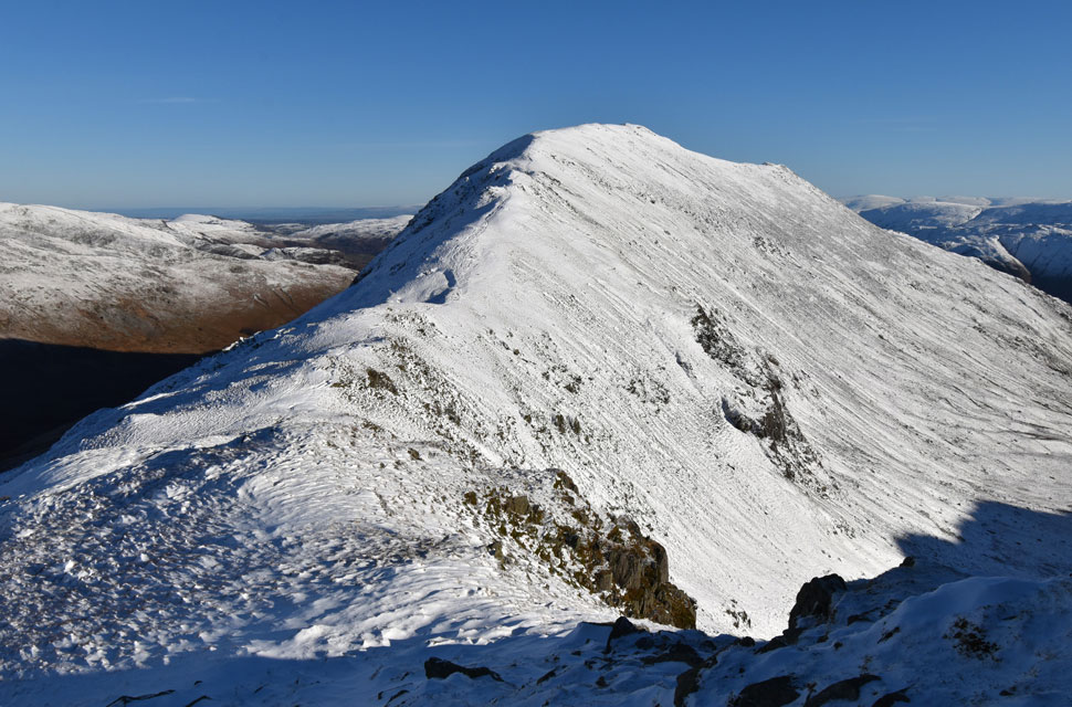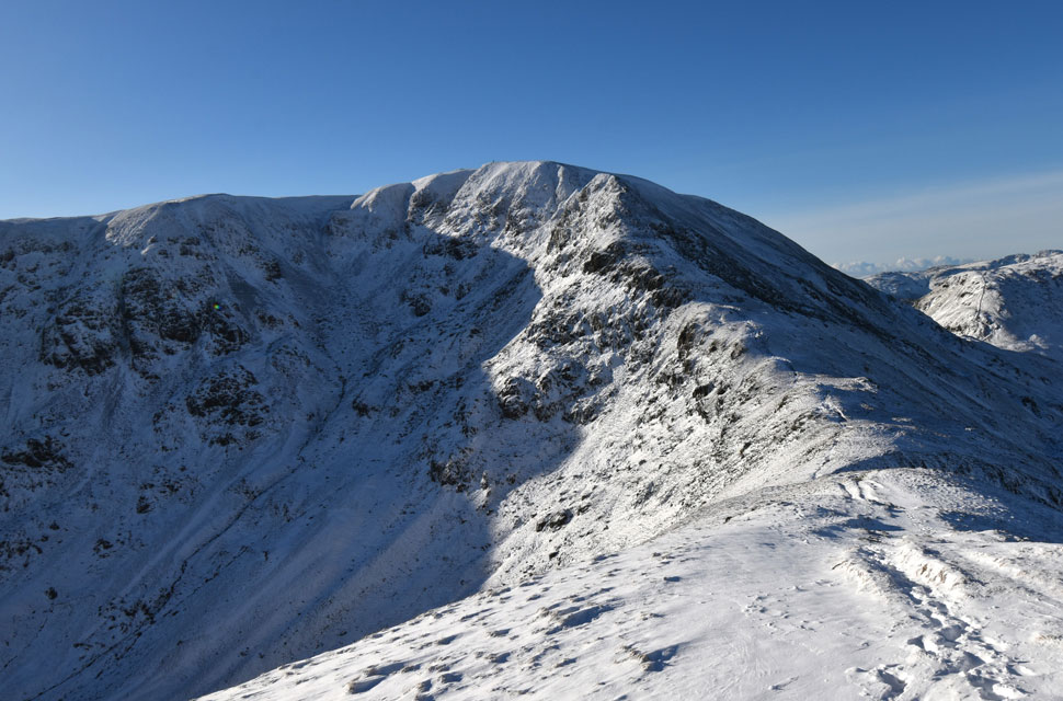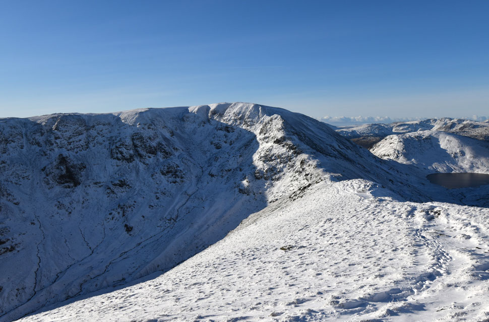 | There was more substantial snow drift as I descended Birks and crossed the col above Blind Cove where I expected the frozen bog to give way but the hard snow held firm before I began my ascent on St Sunday Crag proper. |