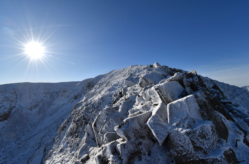 | There is a path that winds its way through the summit crags directly ahead, but I'll be using the much safer path seen towards the right. The path passes below the shoulder, then heads directly onto the summit passing over the frozen patch of snow you can see where my micro-spikes and ice axe definitely came in handy. |
