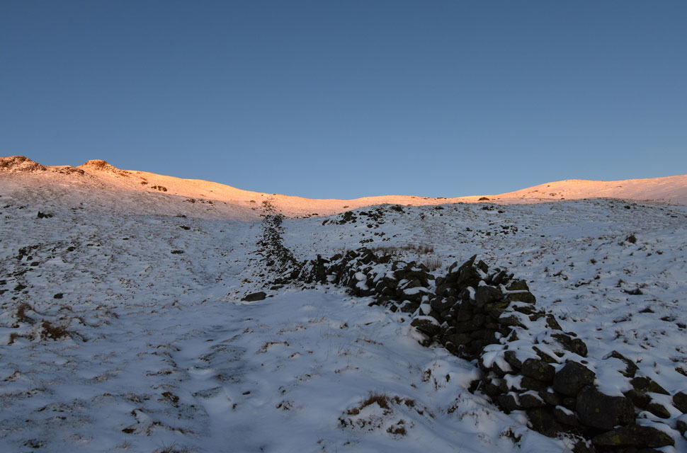 | A hard frost crunched beneath my feet, the perfect soundtrack to my return. Beyond the wall I caught sight of the higher stretch of stonework above Trough Head on the east flank of Birks. That wall climbs steeply onto Birks grassy summit plateau - a route I've often descended, but today would be my first time tackling it in reverse. I wasn't dreading it, exactly, but I knew it would be a lung-buster all the more so after the recent heavy snowfall. |