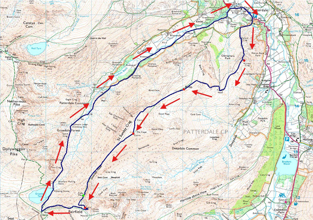 Patterdale - Arnison Crag - Trough Head - Birks - St Sunday Crag - Deepdale Hause - Cofa Pike - Fairfield - Hause Gap - Grisedale Tarn - Grisedale - Ruthwaite Lodge - Elmhow - Patterdale |