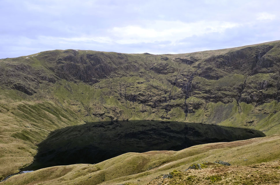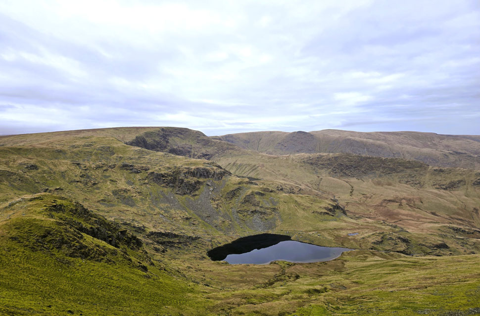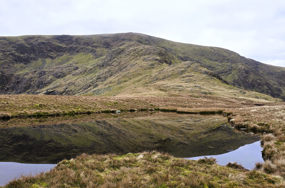 | We descended towards Caspel Gate and soon reached the small, unnamed tarn better known as Caspel Gate Tarn. Here we paused to take in the still water and the reflections of Riggindale Crag across its surface. |
