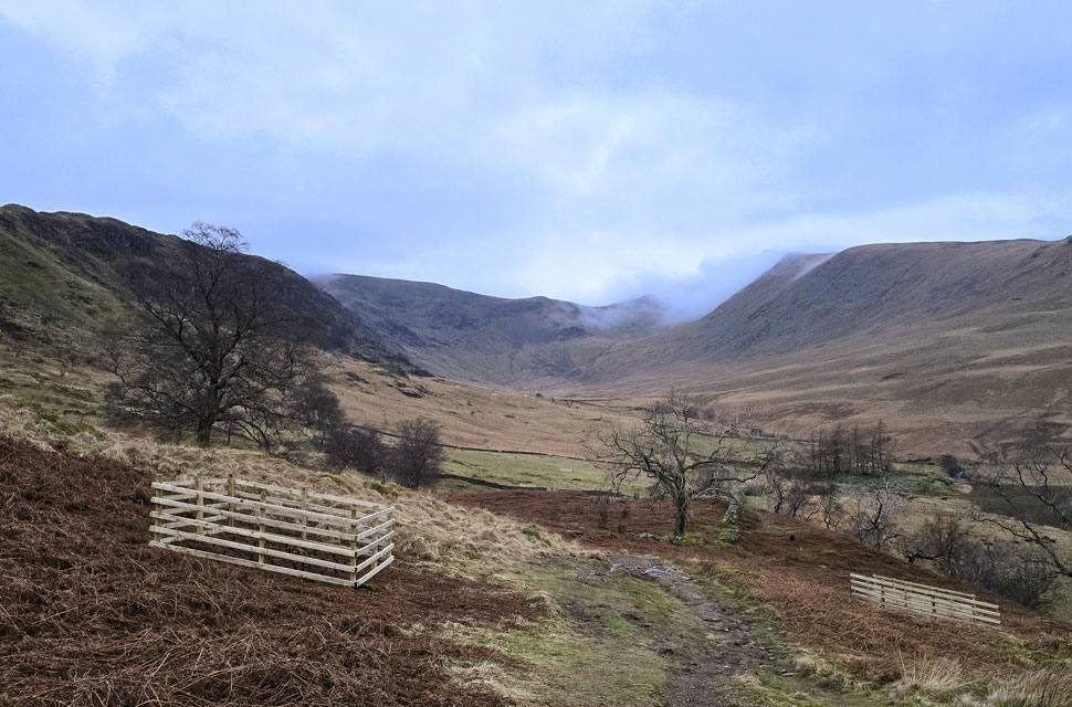 | We stuck to the main path avoiding the muddy short cut as far as The Rigg, where an incredible view opened into the Riggindale valley, the newly erected box-fencing visible in the foreground giving shelter to the freshly planted saplings. |