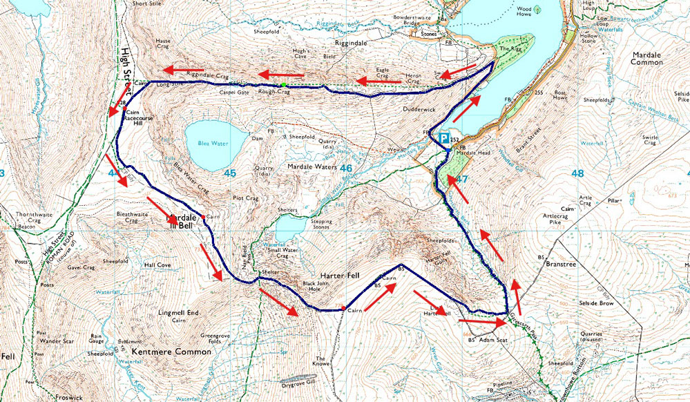 Mardale Head - The Rigg - Rough Crag - Caspel Gate - Long Stile - High Street - Mardale III Bell - Top of Nan Bield Pass - Harter Fell (Mardale) - Little Harter Fell - Top of Gatescarth Pass - Mardale Head |
