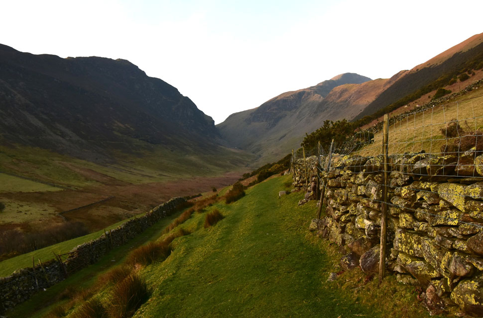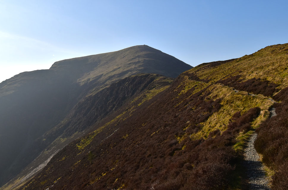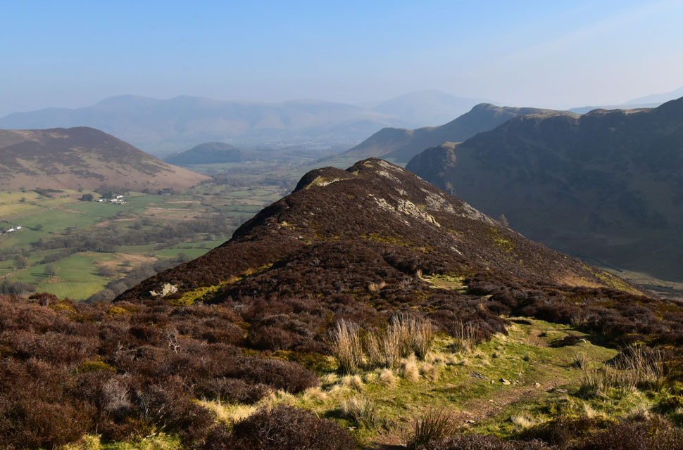 | After leaving the trio, I continued along the ridge, twisting and turning along the narrow, heather flanked path before arriving at Scope End. I paused to take in the view back towards Hindscarth and spotted the trio again, just north of High Crags. The air was warm by this point, and what little breeze there was highlighted the sweat on the back of my T-shirt. The haze still clung stubbornly to the valley and any hope of getting a clear shot into Newlands had all but vanished, the landscape reduced to faint outlines and washed-out light. A real shame I thow't. The path continued to twist and switchback over rock step after rock step - sections I'd forgotten about, but still enjoyed. The silence of the valley was broken by the steady chug of a tractor pulling a trailer towards Low Snab Farm which seemed to take an age. When I finally reached the farm, the farmer climbed out, opened a gate and disappeared into an adjoining field, the chugging continuing as I reached the smooth grassy slopes at the base of Scope End. I turned right towards Low Snab, where I had to negotiate a gate surrounded by slurry. If my new boots weren't already christened, they certainly were now.