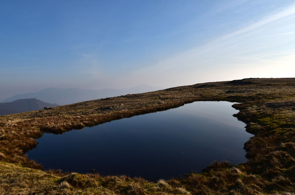 | I shouldered the summit and was treated to a five minute stroll of pure bliss while crossing the plateau where I left the path to enjoy the solitude beside this unnamed tarn north of the summit cairn. |