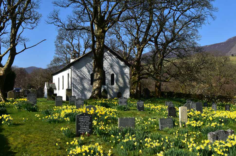 I passed through Low Snab and followed the concrete slabbed lane, just wide enough for a tractor, no wonder he'd been taking it steady, I muttered. Warm haze accompanied me as Newlands Church came into view, along with a lovely glimpse of Hindscarth and Robinson through a gap in the tree lined track. More slurry to negotiate before the track finally spat me out directly in front of the Church, where I spotted two dozen walkers heading towards me in two large groups. Where on earth had they come from? Before they reached the church, I had just enough time to take one last photo of the daffodils glowing in the mid-morning sunshine, then it was back to the car park for an early lunch before the drive home. |