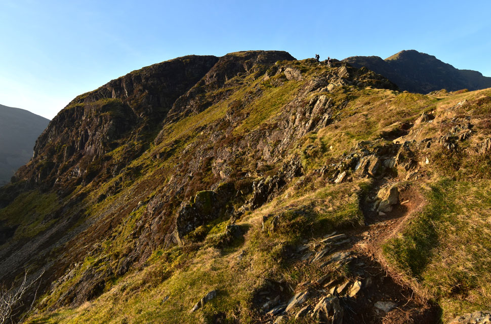 | Leaving High Snab Bank behind where I was finally overtaken by the young couple, who offered two hearty "mornings" as they breezed past. I continued towards the three short scrambles after the grassy col, the second always looking like the trickiest of the lot. |