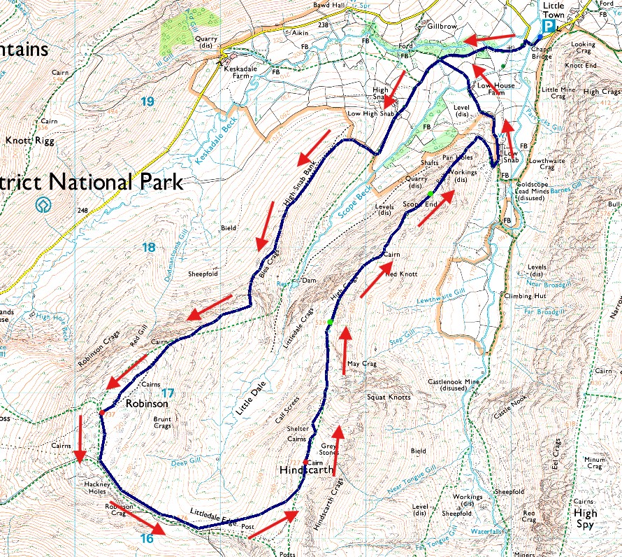 Chapel Bridge - High Snab Farm - High Snab Bank - Blea Crags - Robinson - Littledale Edge - Hindscarth - High Crags - Scope End - Low Snab - Low House Farm - Chapel Bridge |