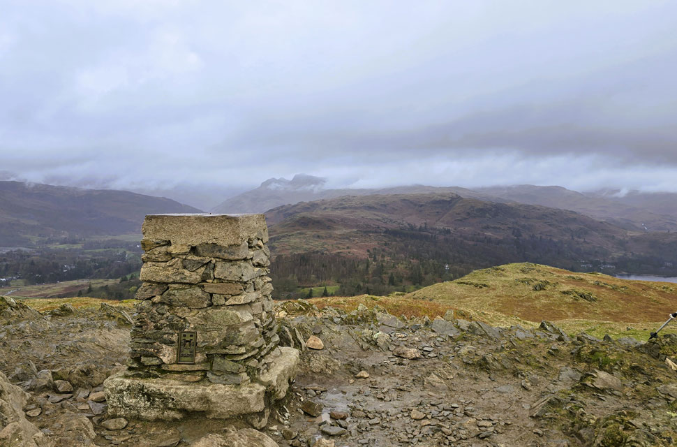 | It almost felt like a lottery win to arrive at Silver How summit in such a peaceful setting: not a breath of wind, and even the faintest hints of sunshine trying to poke through the hazy, multilayered cloud. David glanced at his watch and announced it was only 7:55am. I pulled out my phone to check the forecast, which informed me we had about an hour before the rain might catch us up. |