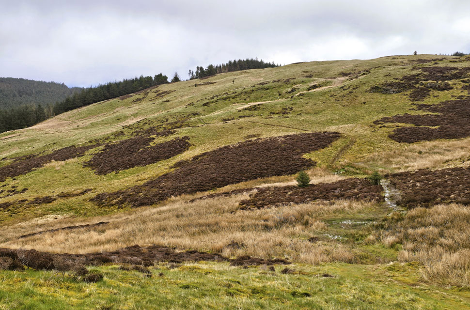 | The original plan was to skirt Tarbarrel Moss to the right, head towards the treeline, then turn north to pick up the forestry track towards Lord's Seat. But after spotting a track cutting straight through the moss, I asked who was up for it. |
