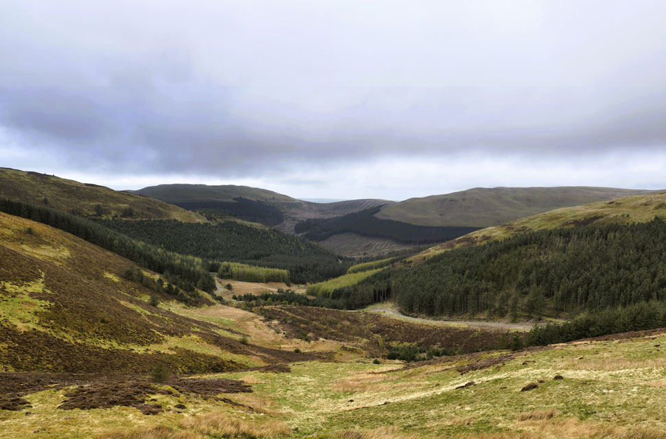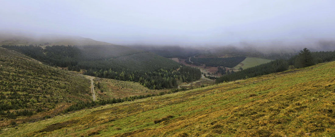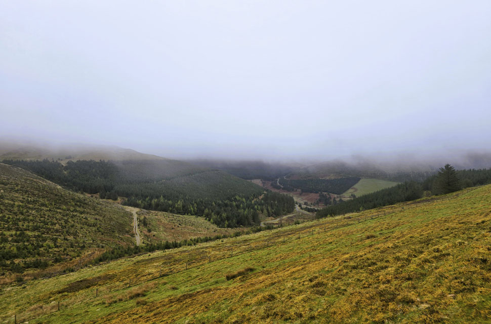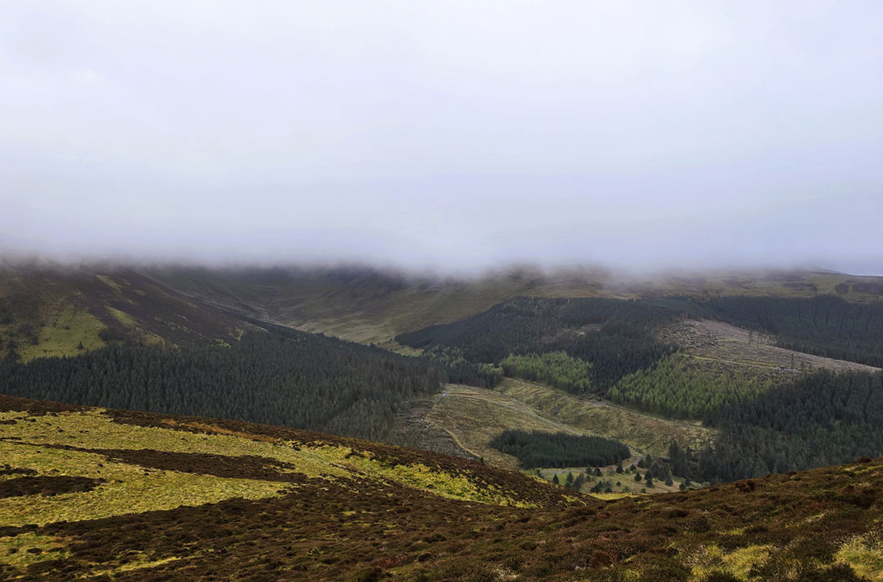 I felt quietly thankful to be exactly where I was at that moment, and I'm sure David and Rod felt the same. We turned heel and began our descent, taking care as the slope steepened, while David pointed out the trod that would lead us down onto the forestry track below. The mood turned jovial, and Rod and I shared a laugh when David announced he was "about to remove his trousers" what he meant was his over-trousers. Still, Rod and I laid into him for the rest of the descent.