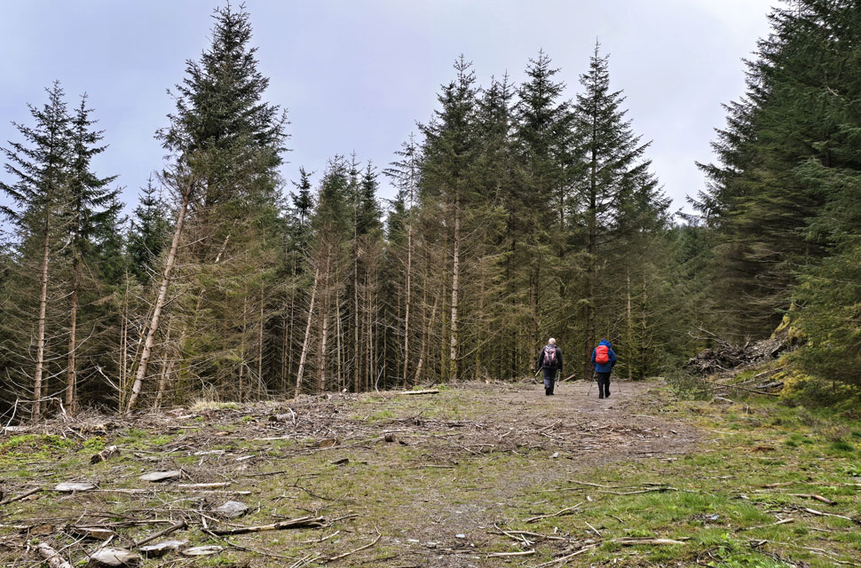 | Continuing along the forestry track, it wasn't long before David spotted the narrow trod cutting across the felled plantation, running almost horizontally towards the stone wall you can see in the lower half of the picture. It was here so early into the walk that I began to flag, allowing both David and Rod to pull ahead while I focused on controlling my breathing while scooping in lungfuls of air. I found the pair waiting for me at the wall where I told them to keep going and that I'd catch up. But being the gents they are, they wouldn't have it and notched it down a gear. |