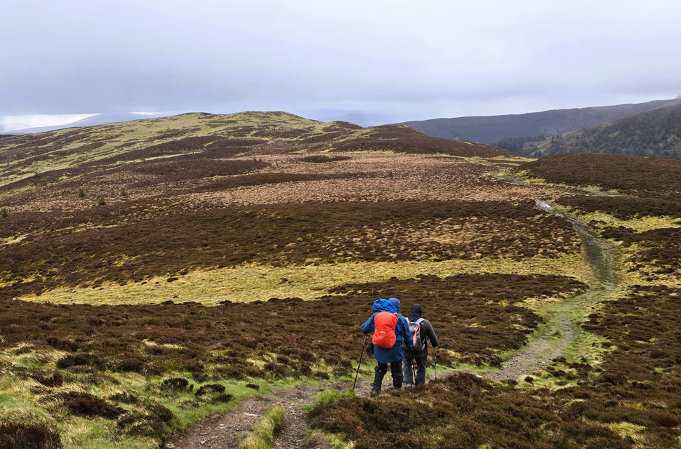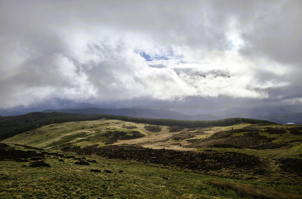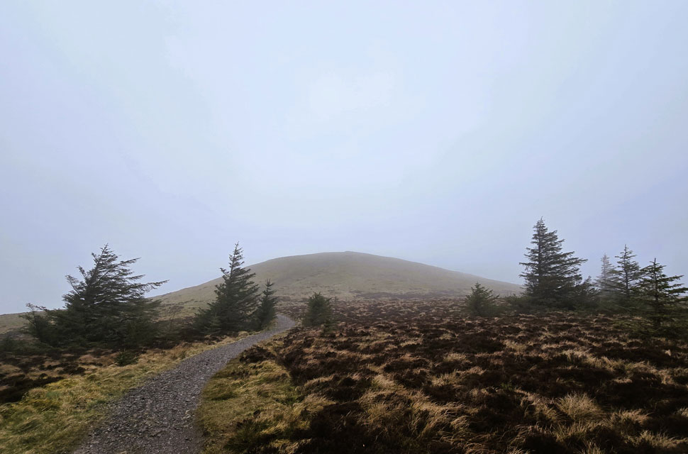 | We left one forestry track for another, descending towards the familiar hair-pin bend where the permissive path for Lord's Seat was just yards away. We stepped off the track and joined the path, walled in by woodland feeling rain in the air first a fine drizzle, then a steady horizontal flow. As we neared the top of the path, with Lord's Seat's summit coming into view from the edge of the treeline, we first had to negotiate a stretch of drenched peat bog. The only way around it was to duck into the woodland, crawling under low branches with more bog squelching underfoot. We eventually emerged on the far side of the mire into gusty winds and horizontal rain. Time to batten down the hatches again. |