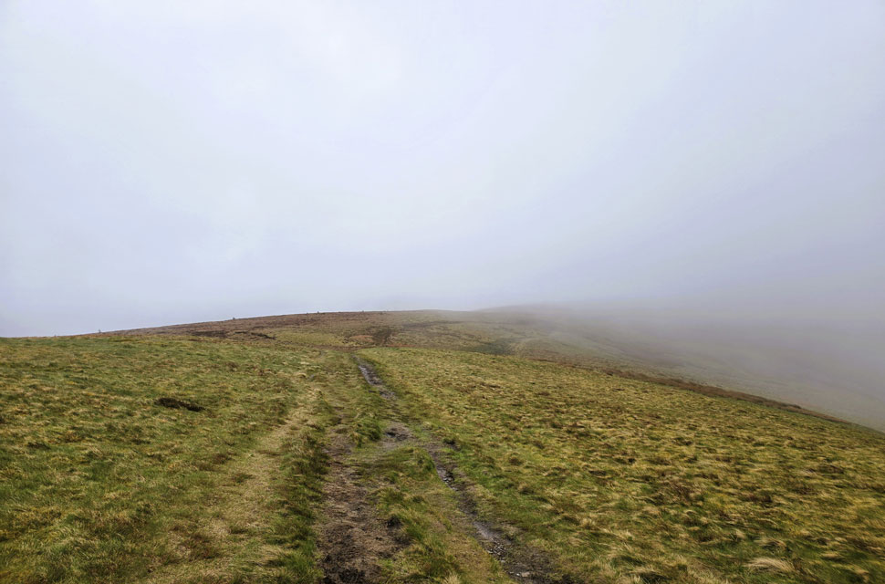 We crossed Widow Hause where we spotted only the second person we'd seen all morning, a young lad descending from Greystones who kindly let us cross the wire fence on the lower slope with a cheery "morning." We hit the steep gradient in good stead, but it wasn't long before I felt my chest tightening again. I let David and Rod pull ahead without them noticing and made it up once the incline eased. We reached Greystones summit and soon sparked into conversation about global news something we're all very much on the same page about and in the swirling mist, we put the world to rights.