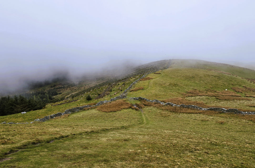 | We were now just below the cloud line, and it felt as though we'd found our second wind. Views began to return as the cloud broke revealing Wythop Moss, and the familiar outlines of Ling Fell and Sale Fell in the distance. |