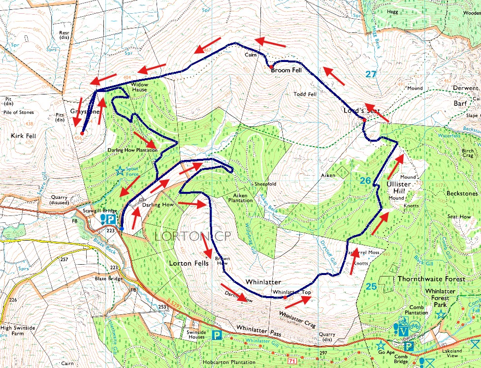 Darling How - Aiken Plantation - Brown How - Whinlatter - Drycloff Gill - Tarbarrel Moss - Forestry Track to Lord's Seat - Lord's Seat - Broom Fell - Widow Hause - Graystones - Return to Widow Hause - Darling How Plantation - Darling How |