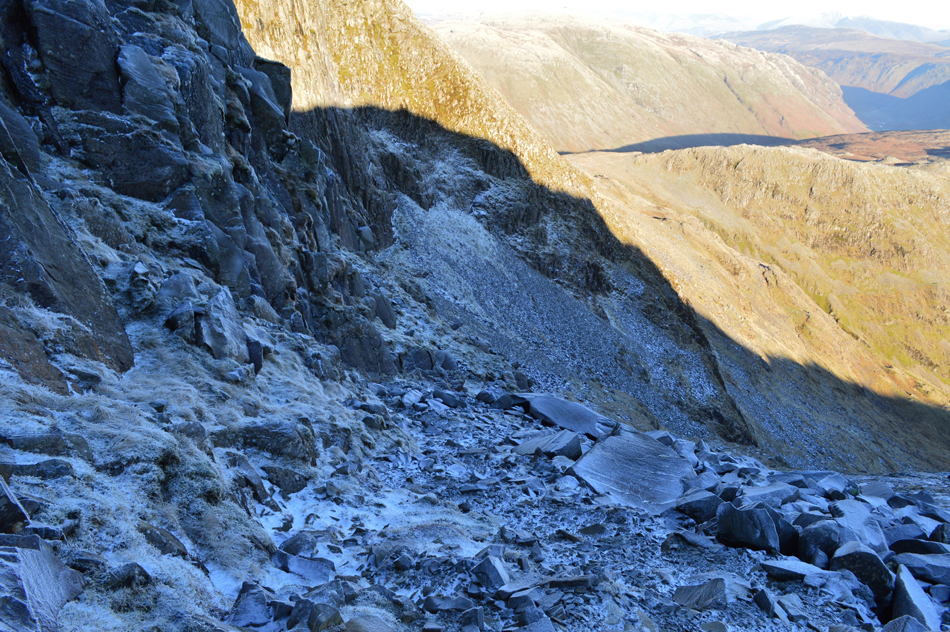 Looking down on the Bow Fell Climbers Traverse from the ascent alongside the Slab. |