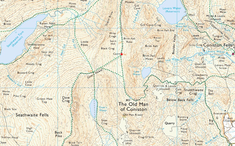 Fell Gate - Crowberry Haws - Boulder Valley - Levers Water - Raven Tor - Brim Fell - Coniston Old Man - Brim Fell - Levers Hawse - Swirl Band - Swirl How - Prison Band - Swirl Hawse - Black Sails - Levers Water - Boulder Valley - Crowberry Haws - Fell Gate |