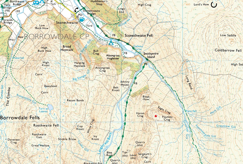 Eagle Crag soars high above the confluence of the valleys of Langstrath and Greenup, its steep cliffs climbing in tiers from bracken slopes to the neat, tapering crest, This is a beautiful fell, often admired, seldom ascended.