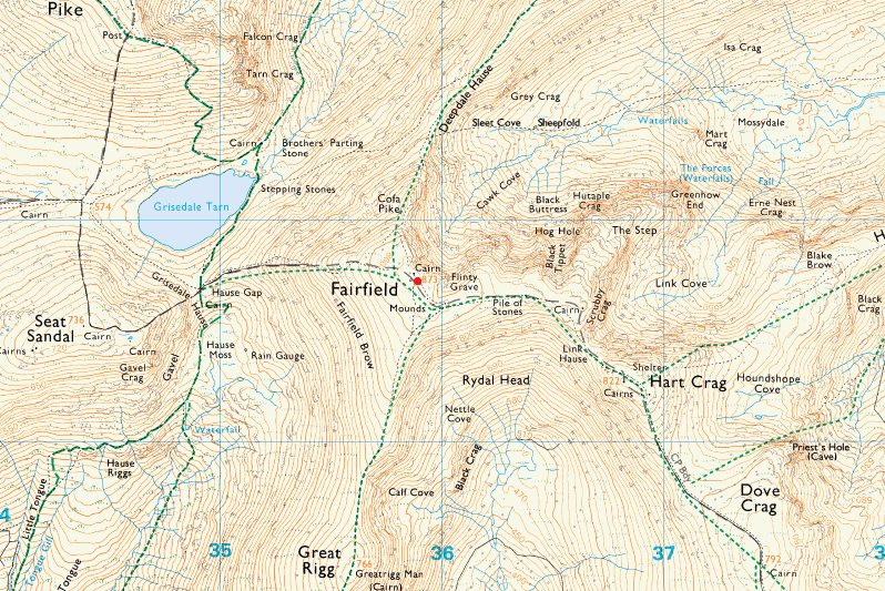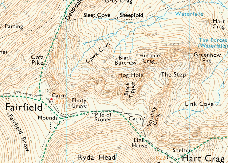 Deepdale Bridge – Wallend – Deepdale – Mossydale – Link Cove – The Step – Link Hause - Fairfield – Cofa Pike – Deepdale Hause - St Sunday Crag - Gavel Pike - Lord's Seat - Coldcove Gill - Deepdale - Deepdale Bridge |