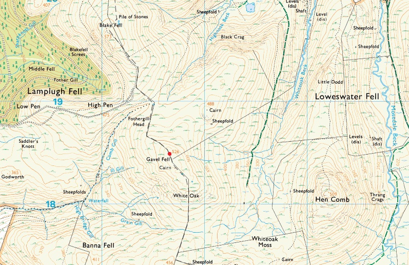 Gavel Fell is the central and second highest of the Loweswater Fells south of the lake, having Blake Fell on the west and Hen Comb on the east. It rises as a well-defined ridge between Highnook Beck and Whiteoak Beck but becomes sprawling towards the summit.
