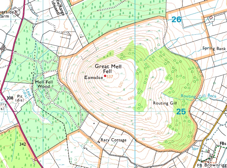 With its lesser twin, Little Mell Fell, it forms the portals to the Helvellyn range on this side. Its round 'inverted pudding basin' does not promise much for the walker and is rarely climbed. On closer acquaintance, however, it is rather more enjoyable than its appearance suggest because of the presence of the fine woodlands on the lower slopes: indeed pines and larches persist almost to the summit.