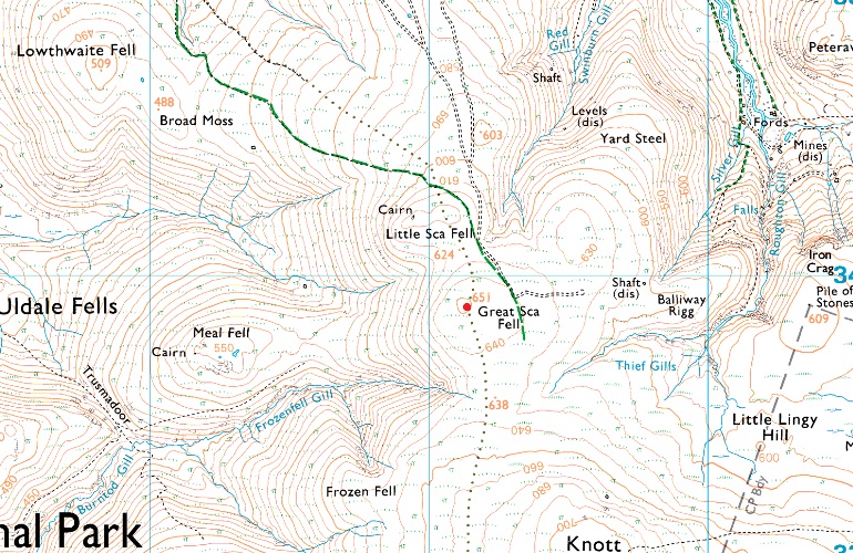The Uldale Fells rise in three ridges between west and north to merge in one common meeting ground at the place of greatest altitude, this focal point being a smooth double-headed uplift of grassy fell, known to cartographers by the names Great and Little Sca Fell, but to the farmers and shepherds merely as Scafell (No resemblance to any other Scafell is intended, nor does it exist)