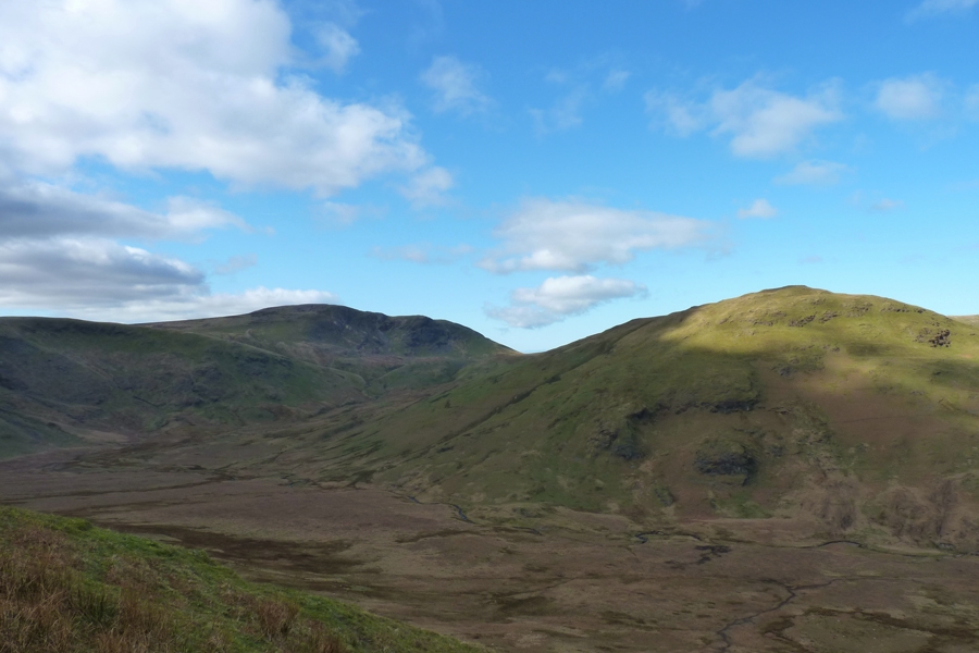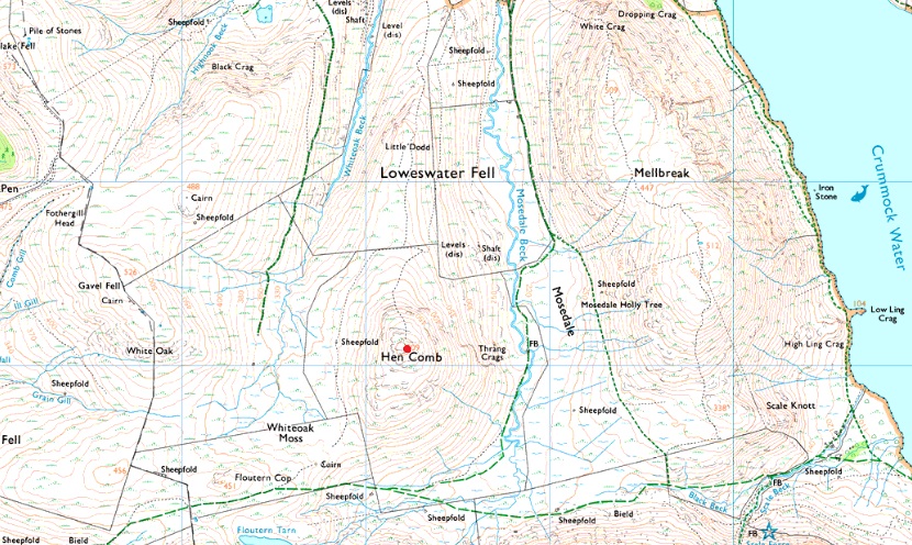 Following the general pattern of the Loweswater Fells, Hen Comb rises as a long ridge from the valley to a round summit set well back, it is a grassy fell, almost entirely with a rock knuckle.