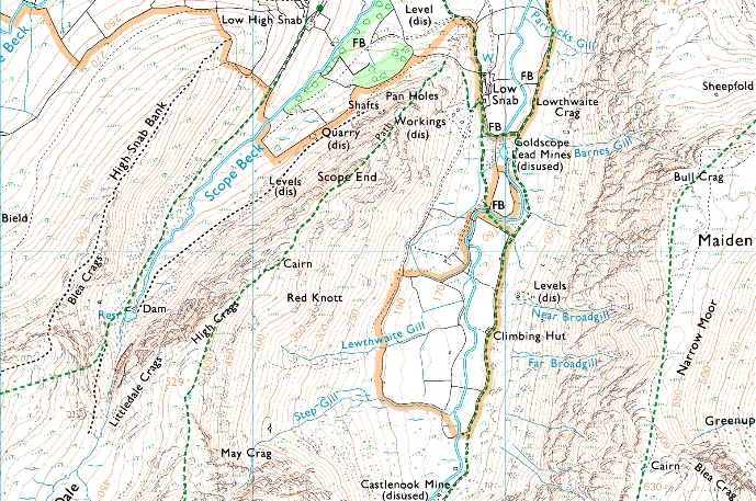 Chapel Bridge - High Snab Farm - High Snab Bank - Blea Crags - Robinson - Littledale Edge - Hindscarth - Hindscarth Edge - Dale Head - Dalehead Quarry - Newlands Beck - Newlands - Little Town - Chapel Bridge |