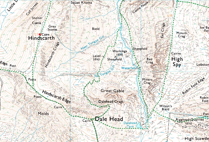 Gatescarth - Folders Wood Hassesshow Beck - Robinson - Littledale Edge - Hindscarth - Hindscarth Edge - Dale Head - Yewcrag Quarry Path - Honister Slate Mine - Honister Quarries - Black Star (Honister Crag) Fleetwith Pike - Fleetwith Edge - Gatescarth |