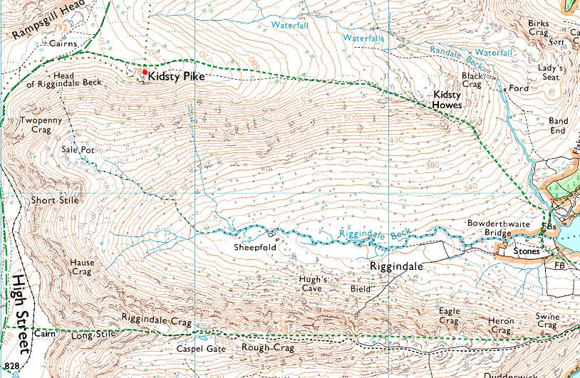 Mardale Head - The Rigg - Rough Crag - Caspel Gate - Long Stile - High Street - Straights of Riggindale - The Knott - Rampsgill Head - Kidsty Pike - High Raise (Martindale) - Low Raise - Castle Crag (Fort) - Randale Beck - Riggindale Beck - The Rigg - Mardale Head |