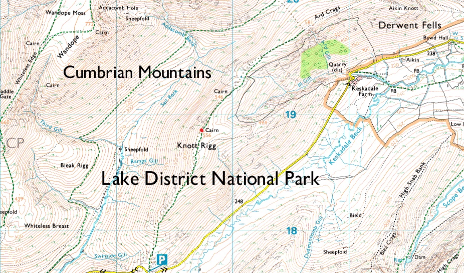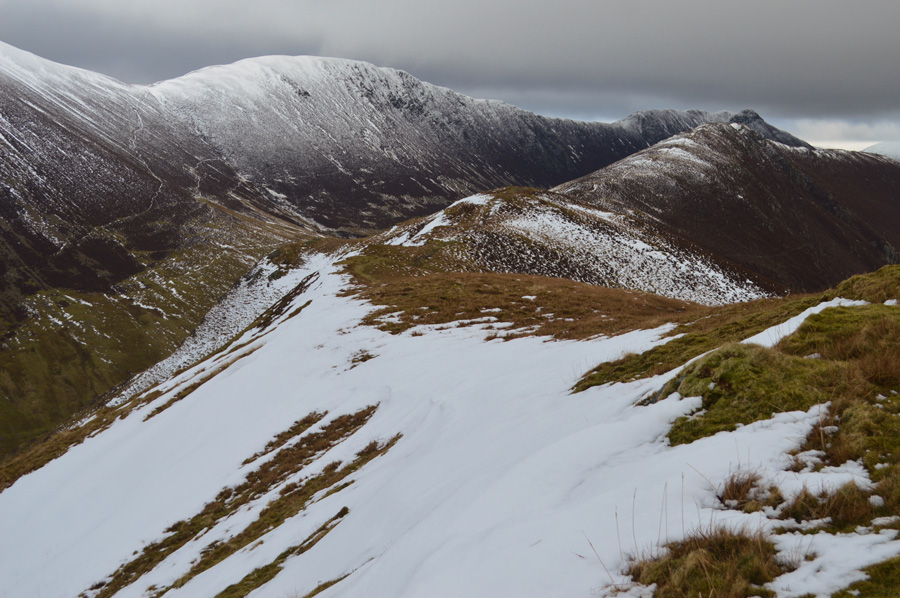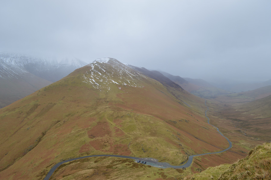 Keskadalw is the long arm of Newlands extending south west and providing the only outlet for vehicles at the head of the valley. The road is accomadated for two long miles along the side of a narrow steep sided ridge of moderate height before climbing over a pass, Newlands Hause.