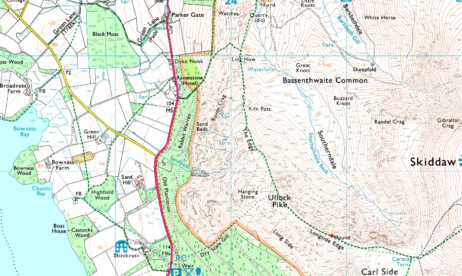 A591 - Old Plantation - Rabbit Warren - Ling How - The Edge - Ullock Pike - Long Side - Skiddaw - Skiddaw South Top - Skiddaw Little Man - Broad End - Carl Side - White Stones - Dodd - Long Doors - Longside Wood - Skill Beck - A591 |