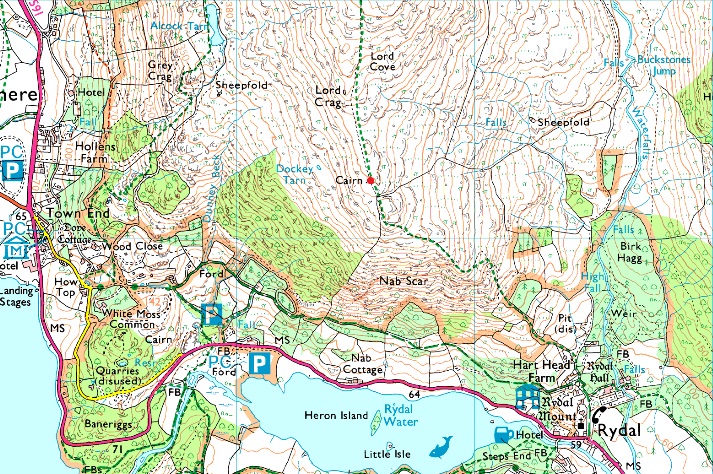 Rydal Church - Nab Scar - Allcock Tarn - Brackenfell Wood - A591 - Loughrigg Terrace - Loughrigg Fell - Loughrigg Cave - Rydal Water - Rydal Church - Rydal Hall - Rydal Church |