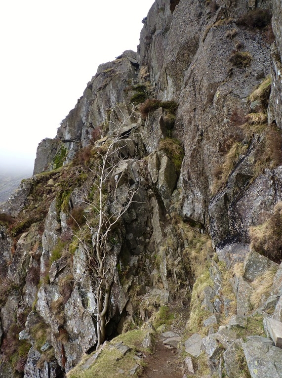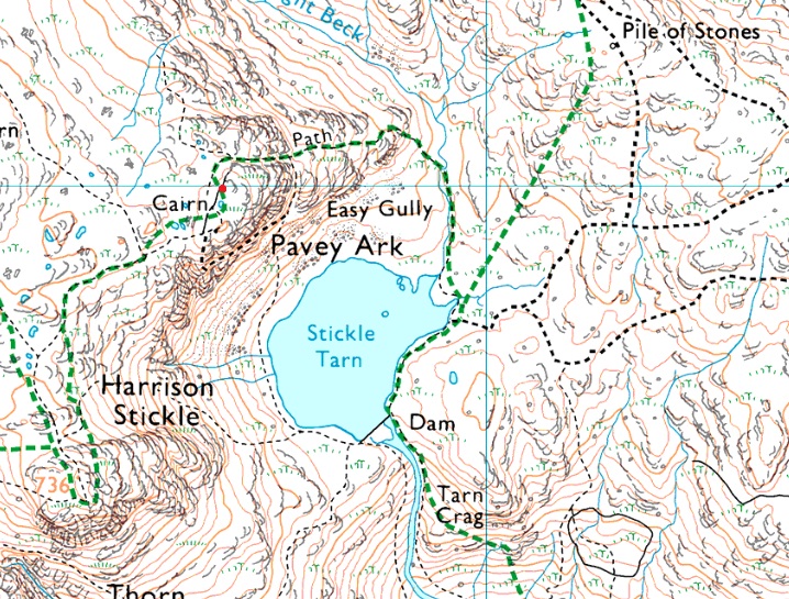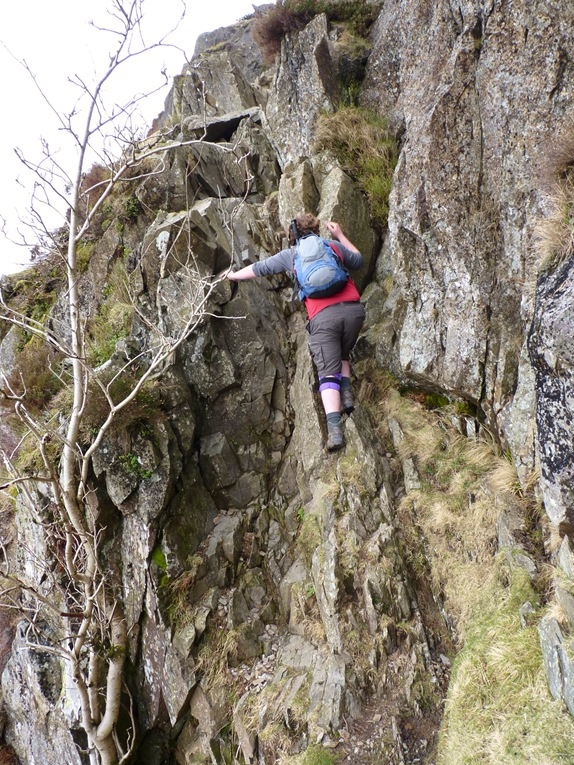 Jack’s Rake is classified as a ROCK CLIMB. Its grading is easy – it is the easiest of the recognised climbs in the Langdale area. Nonetheless, as a WALK it is both difficult & awkward: in fact, for much of the way the body is propelled forwards by a series of convulsions unrelated to normal walking,the knees & elbows contributing as much to progress as hands and feet. Walkers who can still put there toes in there mouths and bring their knees up to there chins may embark on the ascent confidently; others unable to perform these tests, will find the route arduous.
