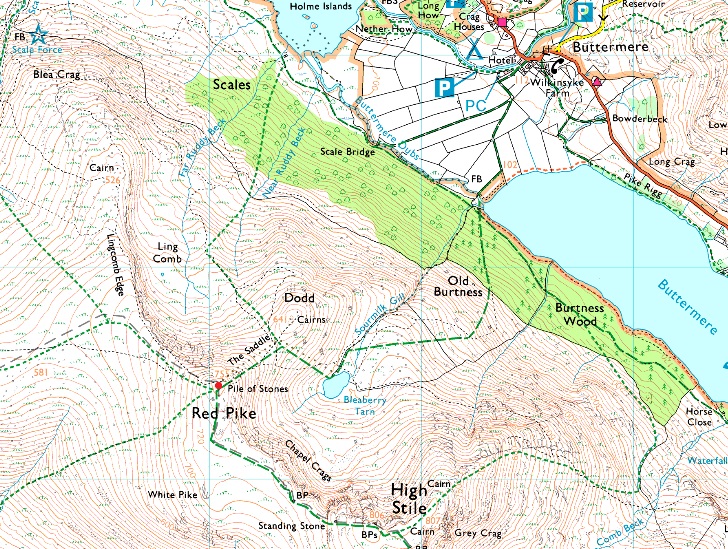 Buttermere – Buttermere Lake Path – Burtness Wood – Above Burtness – Burtness Comb – Sheepbone Rake – Burtness Buttress – High Crag – High Stile – Red Pike (Buttermere) – Lingcomb Edge – Scale Beck – Scale Force – Scale Bridge – Buttermere |
