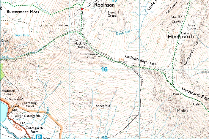 Gatescarth - Folders Wood Hassesshow Beck - Robinson - Littledale Edge - Hindscarth - Hindscarth Edge - Dale Head - Yewcrag Quarry Path - Honister Slate Mine - Honister Quarries - Black Star (Honister Crag) Fleetwith Pike - Fleetwith Edge - Gatescarth |