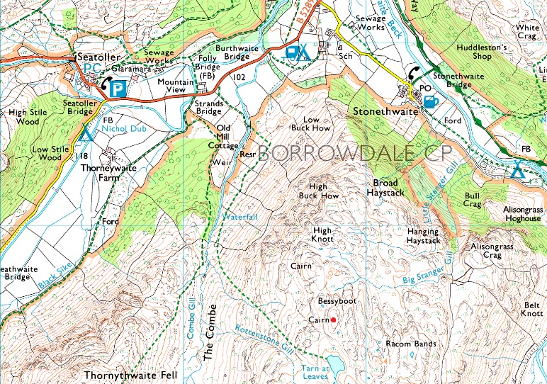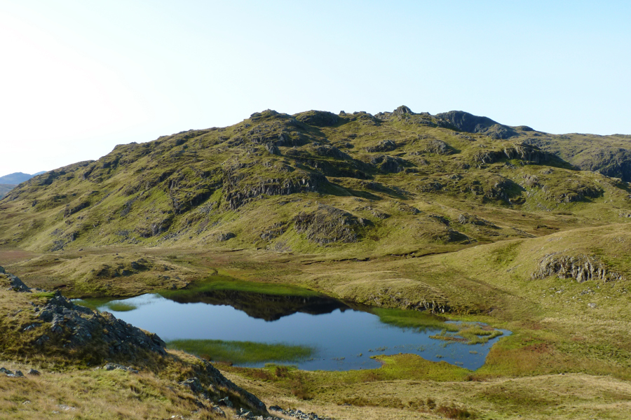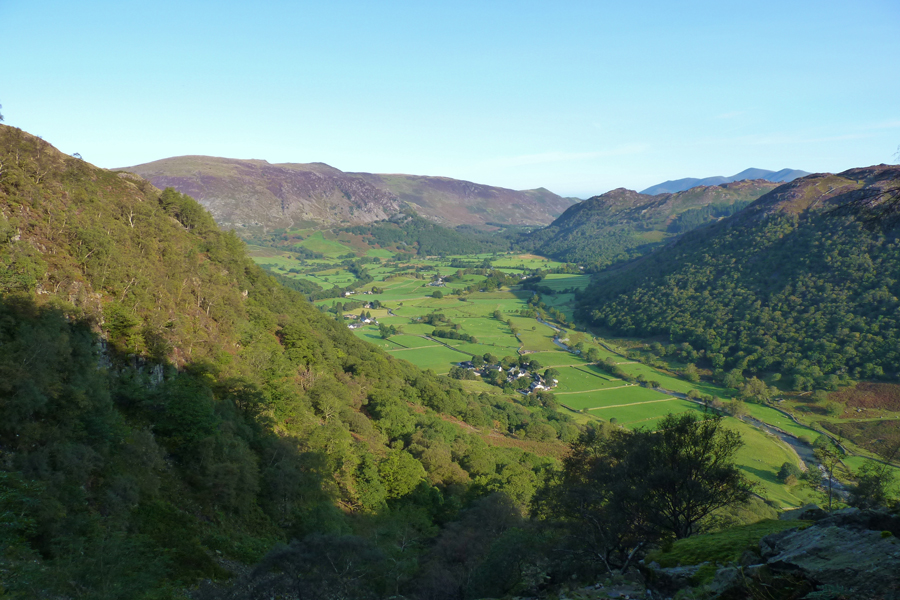 Rosthwaite Fell, shadowing the level strath of the Stonethwaite valley, is really the extremities of the Scafells (although seldom recognised as such) and a strong walker may start from the green pastures here and make a fine high level walk over the fell and the adjacent Glaramara to the summit of Scafell Pike, few do this.