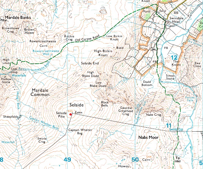 Swindale Lane - Old Corpse Road - Selside End - Selside Pike - Captain Whelter Bog - Howes - Branstree Tarn - Artle Crag - Branstree - Selside Brow - Brownhowe Bottom - Tarn Crag (Longsleddale) - Greycrag Tarn - Grey Crag - Harrop Pike - Brunt Tongue - Mosedale Beck - Swindale Head - Swindale Lane |