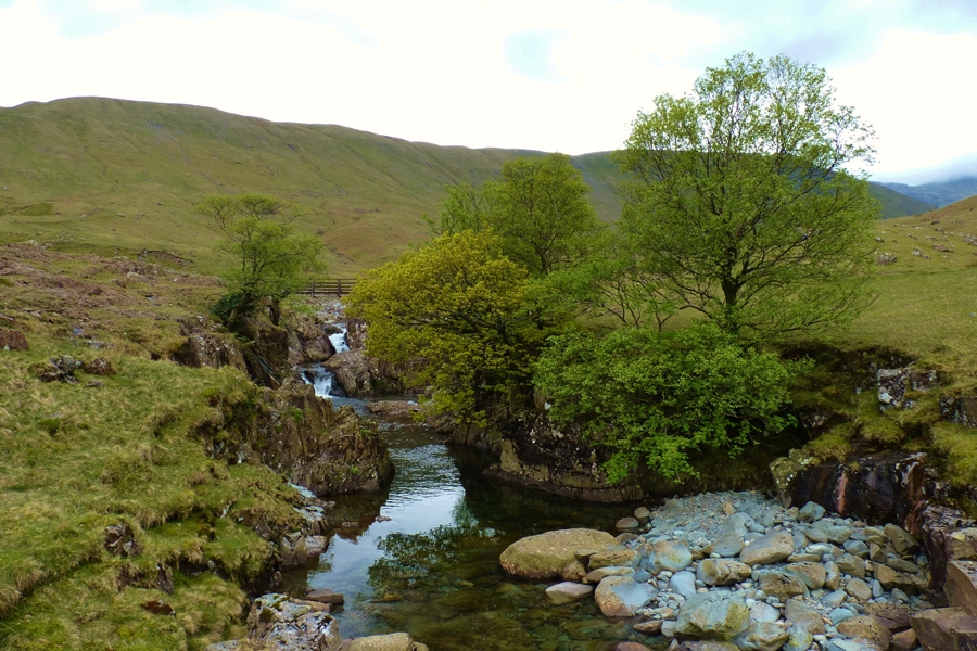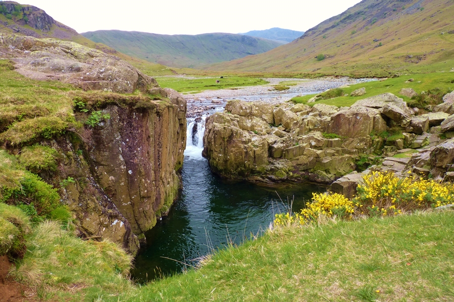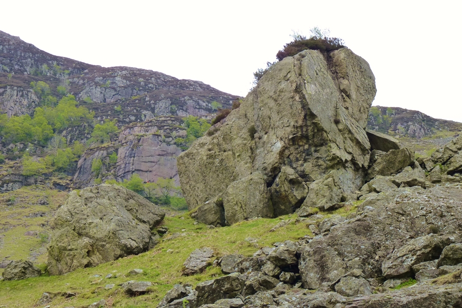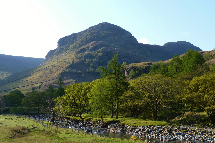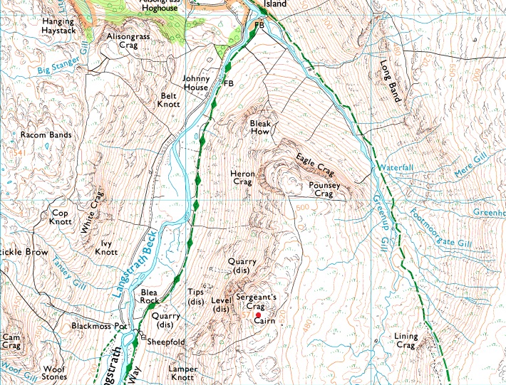 The main crag, over looking the valley, is a sheer wall of rock split by two gullies of which the more prominent is, or was before fashions resort of climbers. The Langstrath slopes are very steep everywhere and a tumble of fallen blocks obstructs easy passage of the popular path to Stake Pass along the base - one huge boulder in particular, Blea Rock, crowning a little rise, is conspicuous landmark here.
