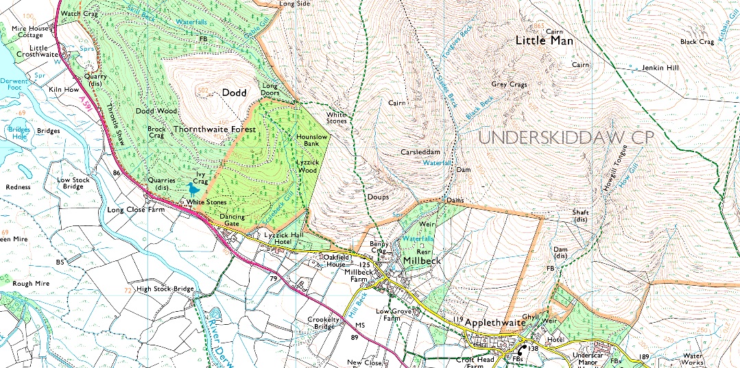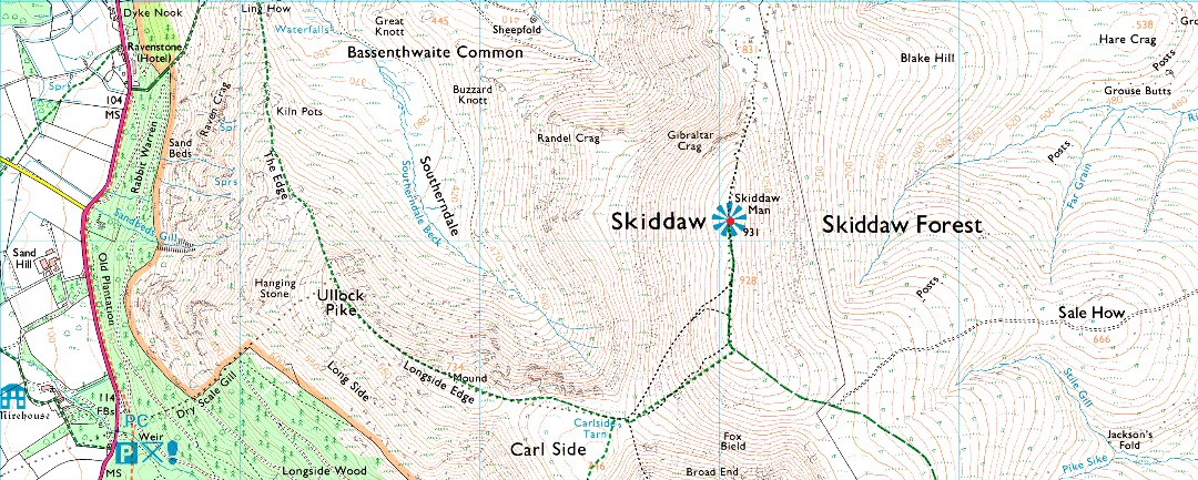 A591 - Old Plantation - Rabbit Warren - Ling How - The Edge - Ullock Pike - Long Side - Skiddaw - Skiddaw South Top - Skiddaw Little Man - Broad End - Carl Side - White Stones - Dodd - Long Doors - Longside Wood - Skill Beck - A591 |