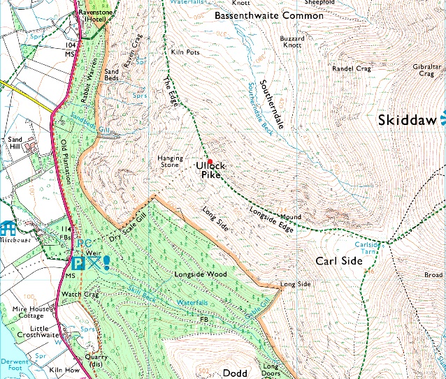 High Side – Watches – Ullock Pike – Long side Edge – Long Side – Carl Side – Skiddaw – Skiddaw Little Man – Lonscale Fell – Skiddaw House – Dash Falls – Bakestall & Cock Up Lower Flanks – Barkbeth – High Side |