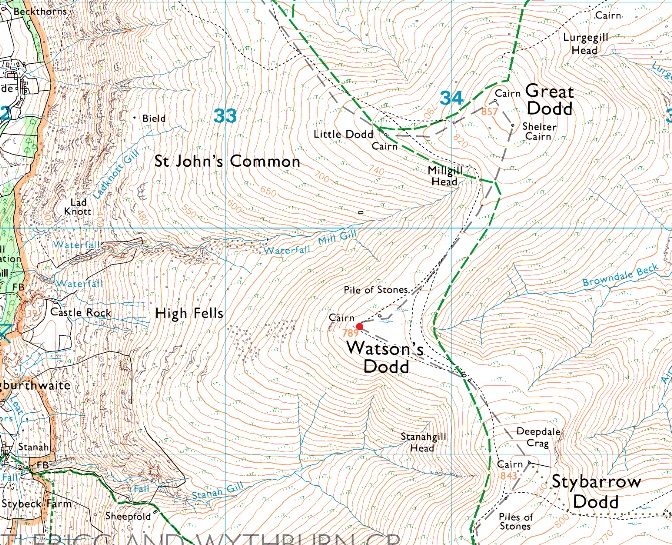 Wanthwaite – Hill Top Farm – Hill Top Quarries – Fisher’s Wife Rake – Jims Fold – Clough Head – Calfhow Pike – Great Dodd – Watsons Dodd – Stybarrow Dodd – Stybarrow Dodd West Ridge – Sticks Pass – Stanah – A591 – St Johns Beck – Bridge End Farm – Sosgill Bridge – B5322 -Wanthwaite |