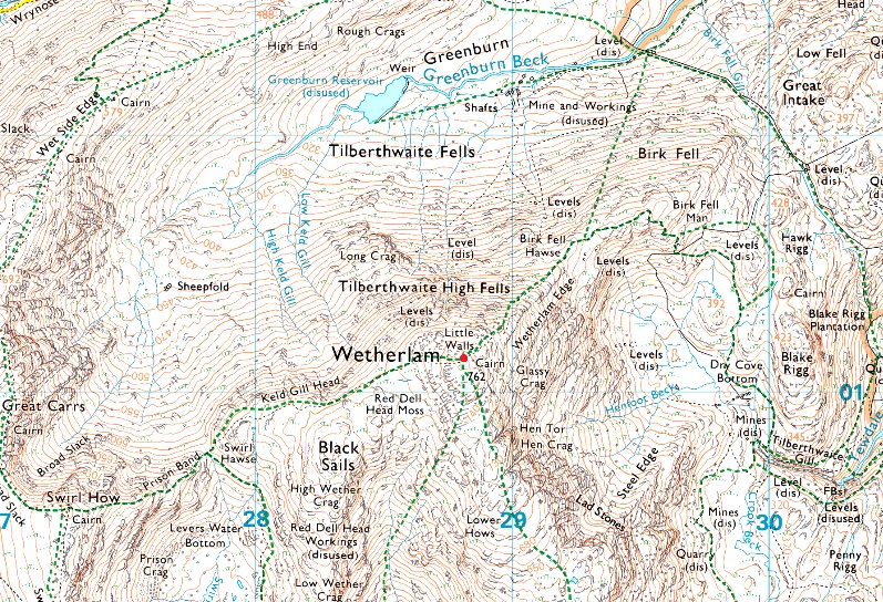 Coniston – Miners Bridge – Church Beck – Coppermines Valley – Simons Nick – Levers Water – Black Sails – Red Dell Head Moss – Wetherlam – Lad Stones – Hole Rake – Church Beck – Miners Bridge – Coniston |