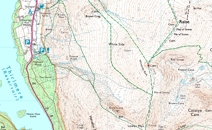 Wanthwaite - Wanthwaite Bank - Clough Head - Great Dodd - Watson's Dodd - Stybarrow Dodd - Sticks Pass – Raise – White Side – Brund Gill– Fisherplace Falls - Fisher Place - A591 - Legburthwaite - Long Band - High Rigg - St John's-in-the-Vale Church - Yew Tree Farm - Wanthwaite Bridge - Wanthwaite |